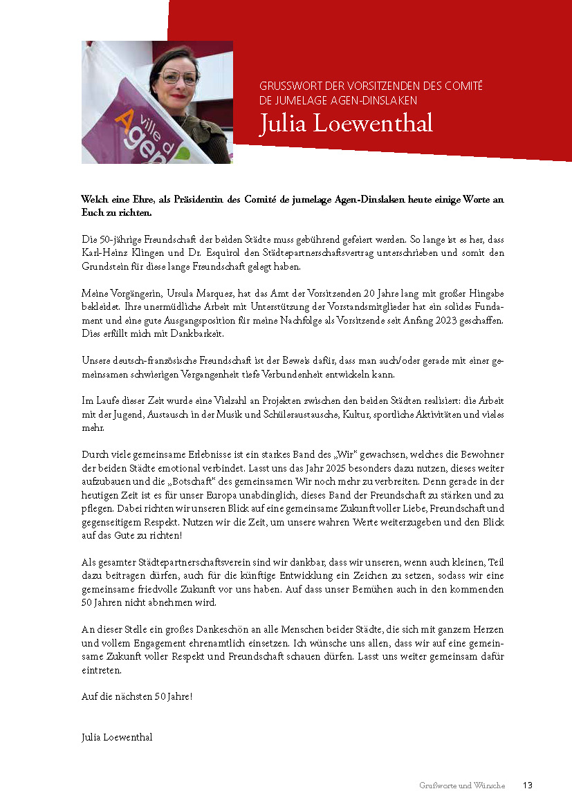 Die guten Beziehungen zwischen Deutschland und Frankreich dauern aus historischer Sicht erst einen Wimpernschlag. Doch Dinslaken und Agen sind im Jahr 2025 bereits seit 50 Jahren offizielle Partnerstädte. Was 1975 als Besuche zwischen Bürgermeistern und Ratsmitgliedern begann, wurde rasch zu einem intensiven Austausch zwischen Vereinen, Schülerinnen und Schülern. Das Comité de Jumelage in Agen und seit 2015 der Städtepartnerschaftsverein Dinslaken e.V. unterstützen diese Beziehungen.
