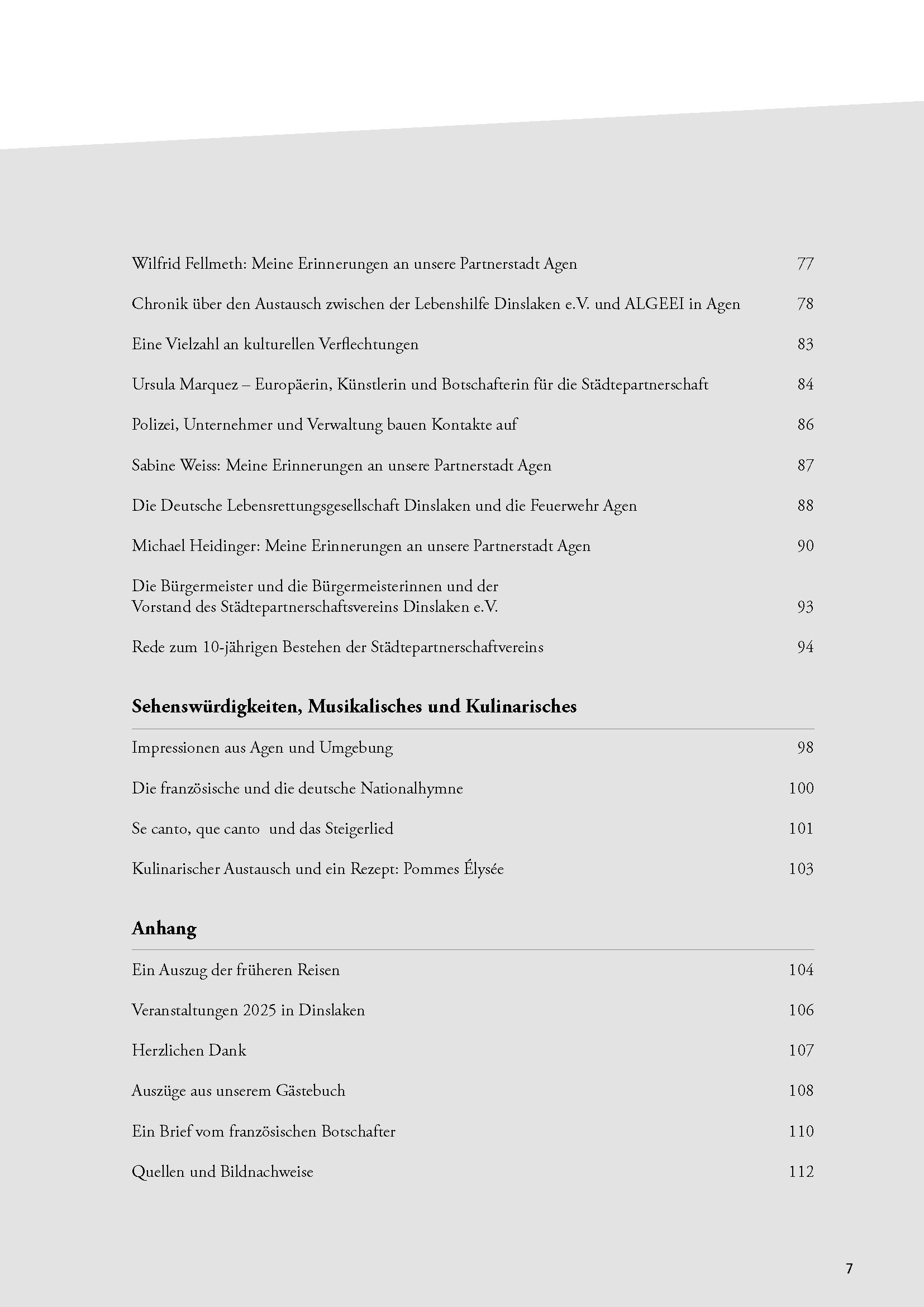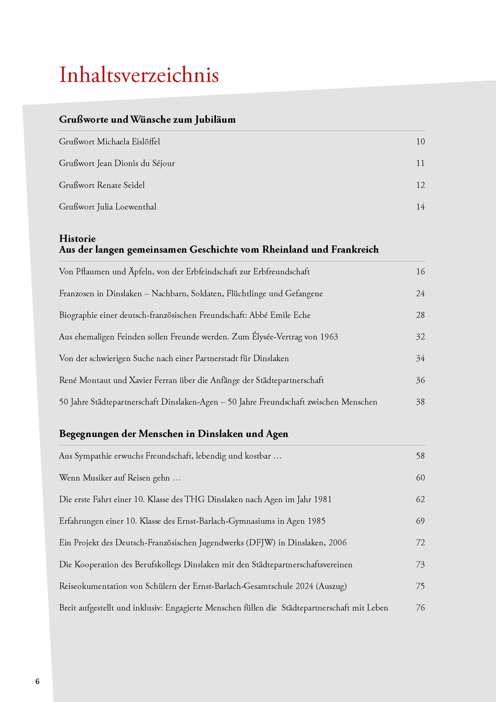 Seit 1983 ist der Austausch zwischen Menschen mit Behinderungen eine Bereicherung für beide Partnerstädte. Bürgerreisen sowie wirtschaftlicher, sportlicher und kultureller Austausch ließen gegenseitiges Vertrauen wachsen. Ein historischer Rückblick auf die deutsch-französischen Beziehungen sowie auf die Anfänge der Städtepartnerschaften im Raum Dinslaken runden das Bild ab.
